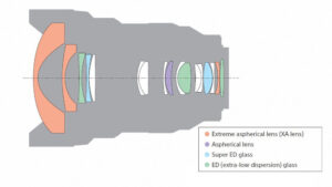 • The optical design includes three XA (extreme aspherical) elements, one standard aspherical element, two Super ED elements, and three ED elements. These work together to minimize distortion, astigmatism, coma, and color fringing. A floating focusing system separates the focus group into two controlled groups, maintaining clarity across the zoom range.